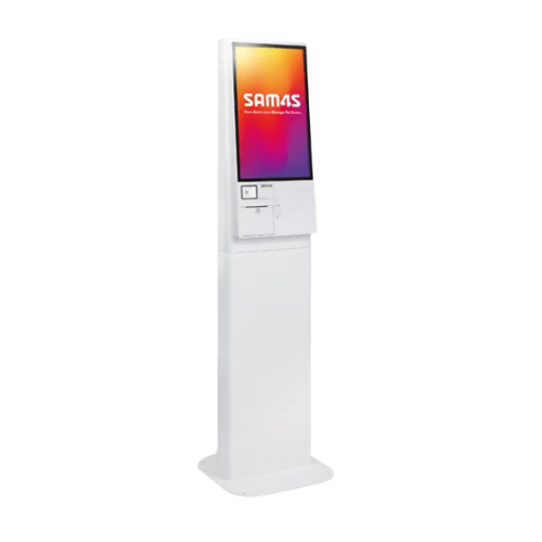 Borne de prise de commande pour restaurants 21,5″, écran tactile FHD, processeur J6412, scanner 2D, imprimante 3″, Wi-Fi, Ethernet et fixation au sol optionnelle.